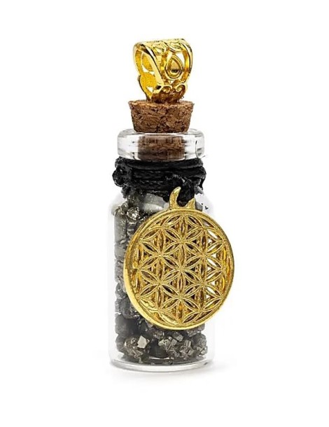 Una piccola bottiglietta in vetro con pietre burattate di pirite dorata, completata da un ciondolo Fiore della Vita in ottone. Fornita con cordino per essere indossata o utilizzata come amuleto decorativo.