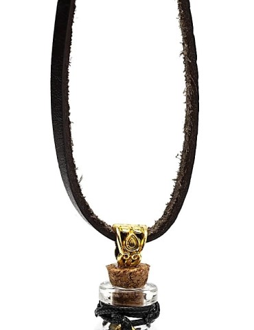 Bottiglietta regalo in vetro con cordoncino in pelle. Per dare energia allo spazio di lavoro, da appendere in salotto o da usare come collana.Misura cm 3.6Paese d'origine India