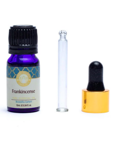 Olio essenziale puro di Franchincenso con pipetta in vetro. Il Franchincenso ha una fragranza dolce, fruttata, calda e legnosa che favorisce una sensazione di pace e di benessere generale quando viene usato in aromaterapia. L'olio di Franchincenso allevia lo stress ed è noto per le sue proprietà antinfiammatorie.