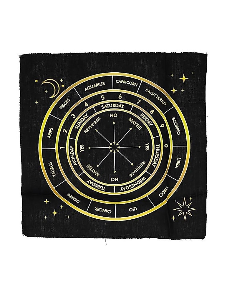Tappetino per pendolo con segni astrologici in inglese Misure: cm 30 x 30 Materiale: Velluto, con ricami in filo di cotone