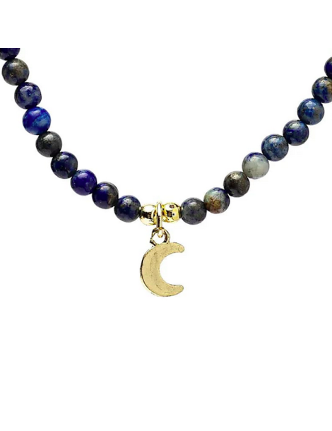 Una collana delicata con perline in pietra naturale da 3 mm lucidate e un ciondolo dorato a forma di luna, simbolo di intuizione, equilibrio emotivo ed energia femminile