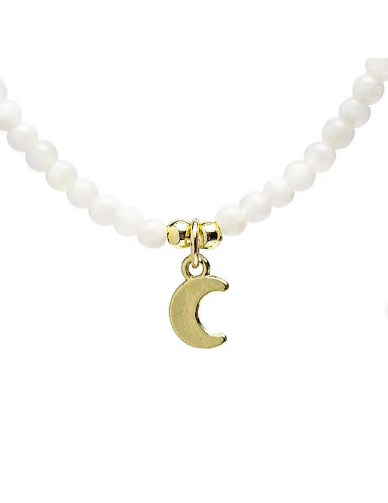 Una collana delicata con perline in pietra naturale da 3 mm lucidate e un ciondolo dorato a forma di luna, simbolo di intuizione, equilibrio emotivo ed energia femminile