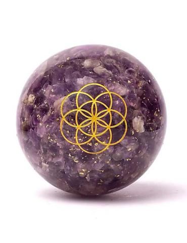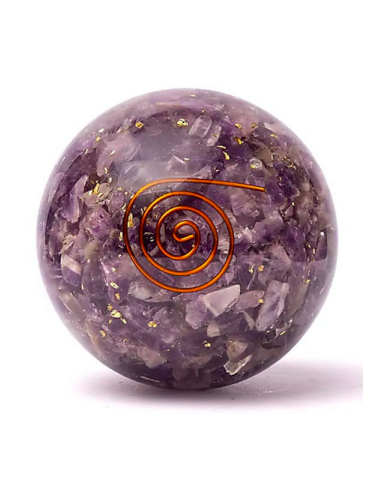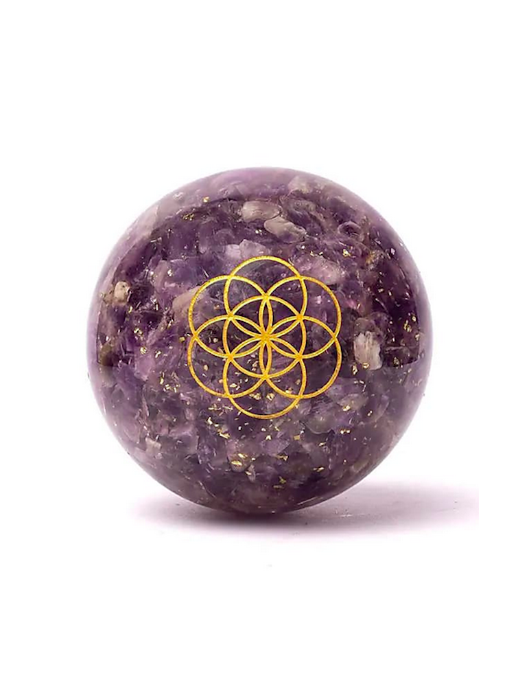 All’interno di questa sfera di orgonite, piccoli frammenti di ametista sono sospesi nella matrice di resina. L’ametista è da tempo apprezzata dai terapeuti di cristalli per la sua presunta capacità di favorire il pensiero chiaro e l’equilibrio emotivo. Il suo tono viola è spesso associato al chakra della corona, il centro dell’intuizione e della prospettiva.